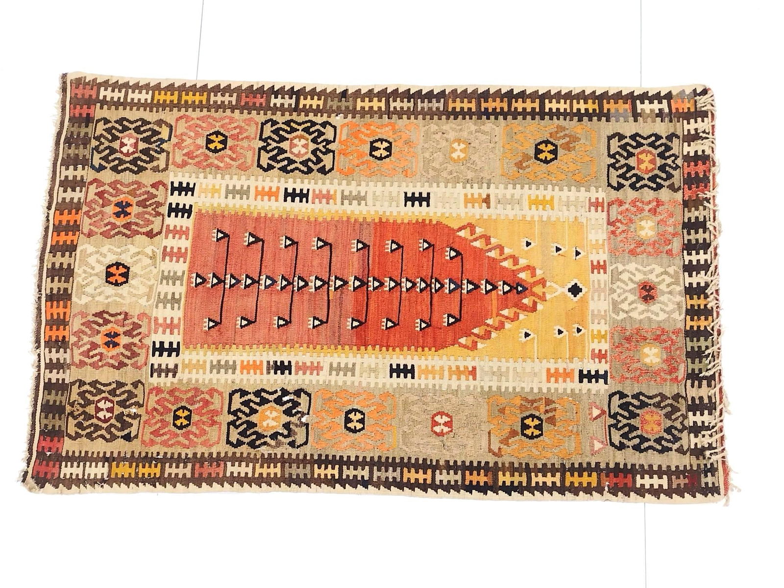 SoldKilim Area RugKilim Area Rugorange ground with three diamond shaped medallions and with tree-of-life and figural motifs. 5 ft. 9 in. x 9 ft. 2 in. From the Collection of Eugene and Diana Best, Mocksville, North CarSee Sold Price