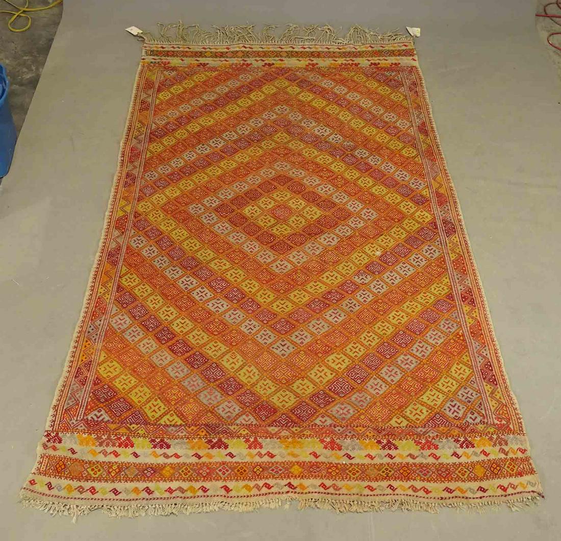 SoldKilim Oriental RugAll hand woven in pleasing geometric pattern in bright colors, circa 1960's, 51 x 74". Condition Fine, has been used as a wall hanging for years.See Sold Price