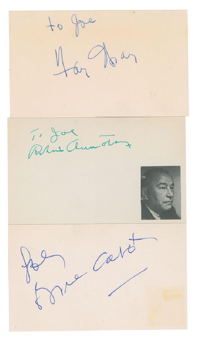 Lot of (5) signed 3X5 cards of Opera Singers & PianistsFeb 26, 2026Nine MLB Legends Signed Government Postcards from the 1950s2 days LeftLITERATURE - ZIEGLER Henri Geneva, 1906 - ib., 1970 - Philologist and Writer with a Thoughtful Pen476 Lots Away(32) GERMAN WWII OFFICIALS SIGNED NOTES, GORING FORMS2 days LeftAutographed Documents, United States Presidents6 days LeftJackie Robinson Roy Campanella Signed Index Card 1953 Dodgers JSA Authenticated3 days LeftPolitical and Famous Person Photo, Letter and Autograph Archive 1Mar 01, 2026Bob Champine, Fred J. Ascani & R.J. Harer – Aviation Greats – Autographed 5.25 x 3.25A Collection of Signed Index Cards and Cut-outs Featuring Notable Figures from Film, Television, andMar 08, 2026Jacqueline Kennedy – Personally Owned Unused Stationery & Ephemera (4 Pieces) – White HoTom Ferebee – Enola Gay Bombardier – Group of Three Autographed Cards (One with CanceledJohnny Unitas All-American Sports Camp AutographsFeb 28, 20261950s Dodgers Signed Album Page Jackie Robinson Hoyt Wilhelm JSA3 days LeftElizabeth Taylor Signed Cut Signature JSA Authenticated Hollywood LegendFeb 18, 2026André Maurois – Renowned French Author – Collection of Four Autographed Letters: Th1934 Japan Tour Team Signed Sheet Babe Ruth Lou Gehrig PSA JSA3 days Left