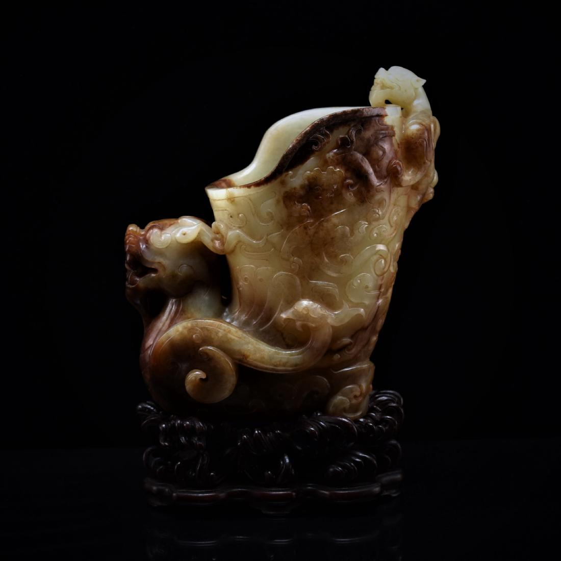 KIRIN AND TIGER CARVED JADE LIBATION CUP