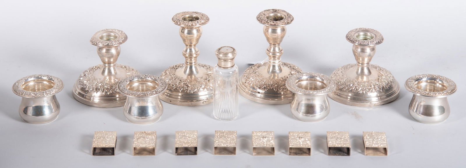Kirk Repousse Sterling Candlesticks, Match Box Covers, Toothpick Holders