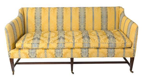Vintage Recessed Arm Curved Sofa + 2 Throw PillowsRegency style curved back sofa in luxurious golden yellow upholstered fabric with kick pleat skirt. Includes two throw pillows. Seat measures 50"L x 23"Depth. Dimensions: 64" L x 33" W x21.5" HSee Sold Price