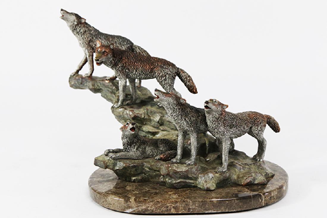 Sold:Kitty Cantrell, "Gossip Column"Contemporary bronze sculpture. Five wolves on a cliff. On marble base. Signed K. Cantrell, 1995, Legends USA, 83/500. Approx. 10" x 10" x 14".See Sold Price