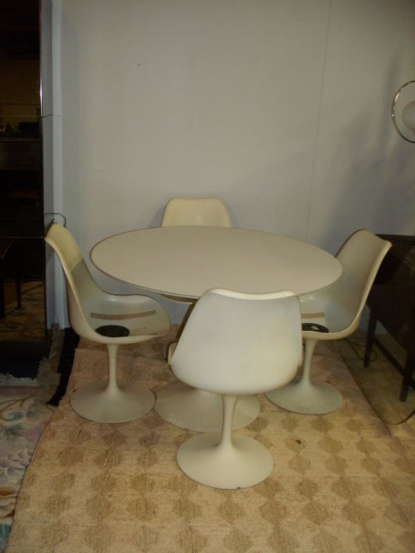 SoldSaarinen For Knoll Tulip Table and ChairsThis 1970's Knoll white tulip table and 4 cushioned swivel tulip chairs is designed by Aero Saarinen. There is a very faded old Knoll label under the table top. The table measures 29" tall X 36" acrosSee Sold Price