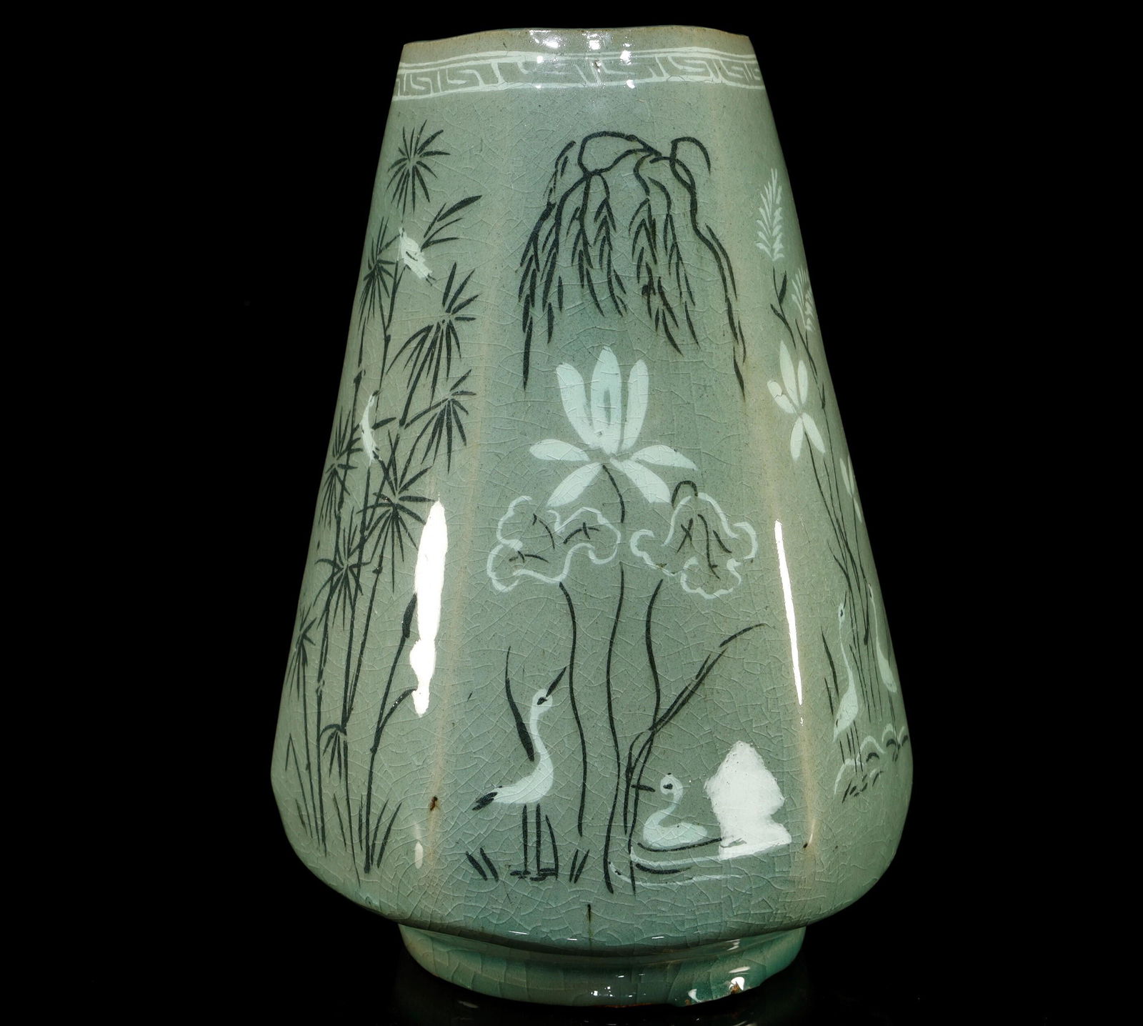 Korean Celadon-Glazed Floral Hexagonal-Shape Vase