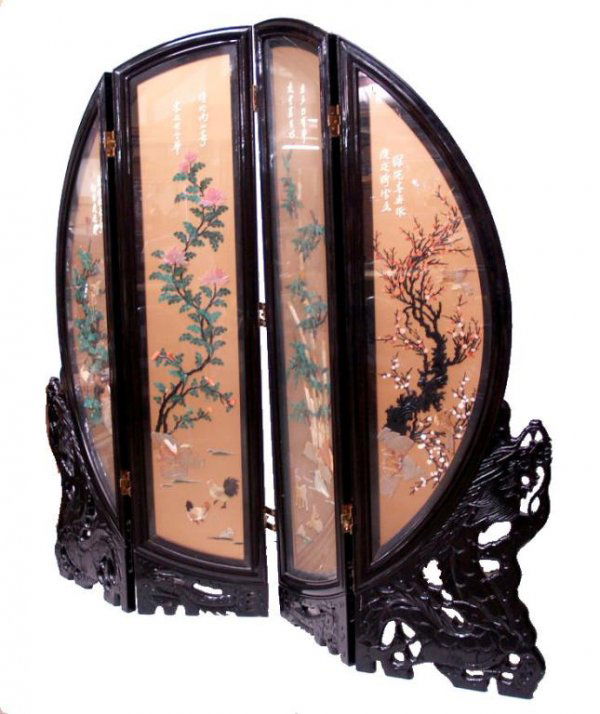 SoldChinese Hardstone Inset Lacquer Four Panel ScreenChinese Hardstone Inset Lacquer Four Panel Screen19th C.Losses, surface distress, damage.70 x 17 in. (177.8 x 43.2 cm.)See Sold Price