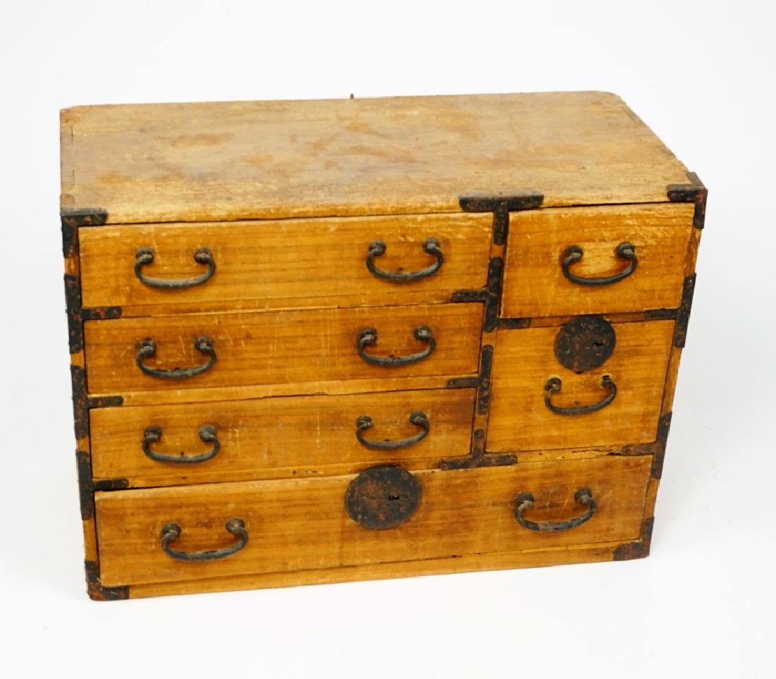 Sold+Korean Bandaji chest on stand, late 19th/early 20th C., upper front with drop-down desk held by+Korean Bandaji chest on stand, late 19th/early 20th C., upper front with drop-down desk held by chains, leather writing pad, six small drawers and six letter slots inside desk, lower cabinet sectionSee Sold Price