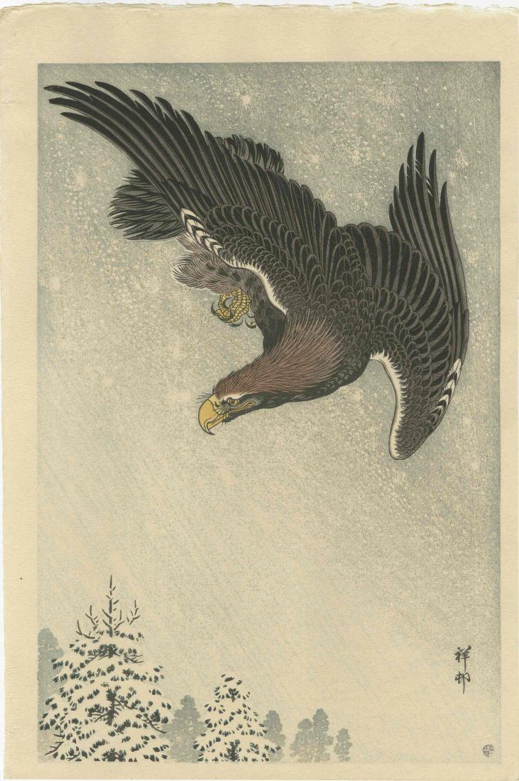 KOSON OHARA - EAGLE FLYING IN SNOW - 1930s