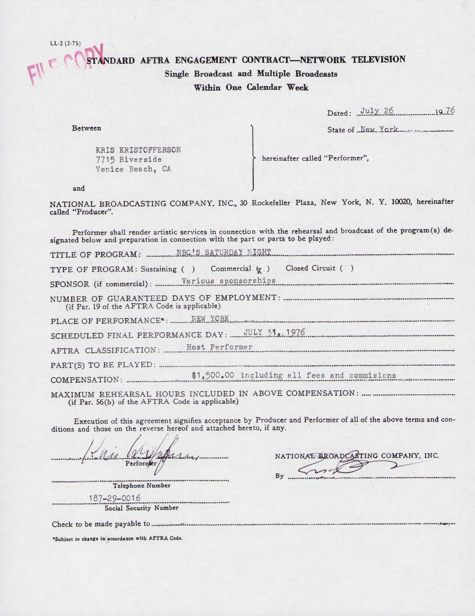 SoldKris Kristofferson signed contractKris Kristofferson signed contract to appear in Sat Nite Live in 1976 Certificate of AuthenticityEVERY item in this auction comes with at minimum a fully illustrated and serial numbered COA signed bySee Sold Price
