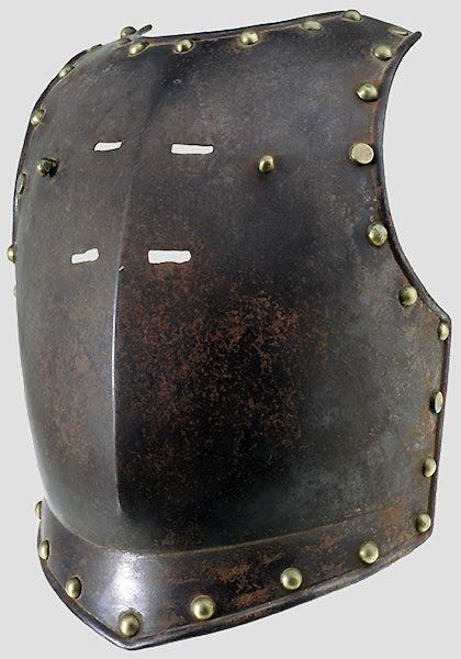 Schwere Kürassbrust,deutsch, 2.Hälfte 17.Jhdt. Schwere, gegratete Brustplatte, Arm- und Halsausschnitt mit kräftigen Brechrändern. Umlaufend Futterlöcher, auf der Brust zwei Schildzapfen zur Befestigung der SchuppenkSee Sold Price
