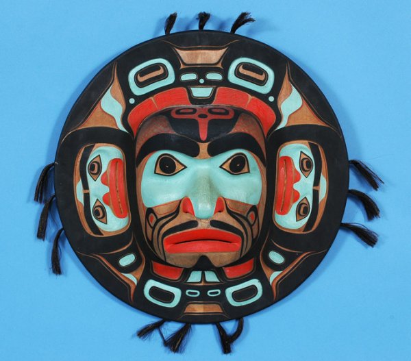 SoldBILL BOUCHARDKwagiuth Style Moon Mask of a Bear, in carved and painted cedar, signed on back and dated 08/01. 22" diam. Fine condition.See Sold Price