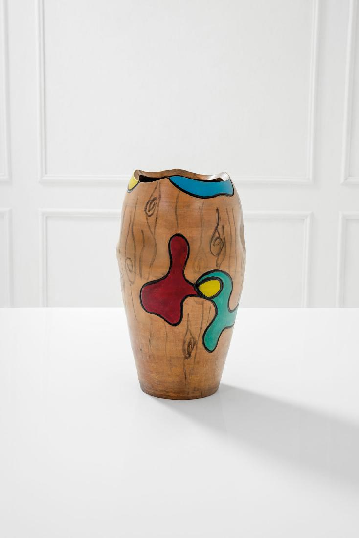 SoldLa FiammaGrande vaso di gusto futurista Terracotta smaltata. Prod. La Fiamma Albisola, 1935 ca. Sotto la base marchio della Fabbrica. h cm 45, diam. max cm 28See Sold Price