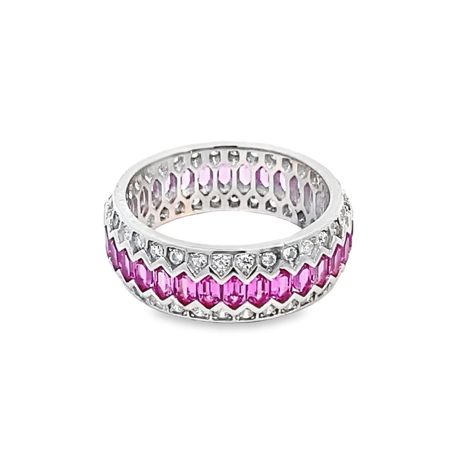 SoldAntique Art Deco Platinum Natural Ruby Diamond Eternity Band Ring Size 5.5This is an antique Art Deco platinum natural ruby and radiant cut diamond ladies eternity band ring. The diamonds are VS in clarity and GH in color. The ring is a size 5.5US and it weighs a total of 2See Sold Price