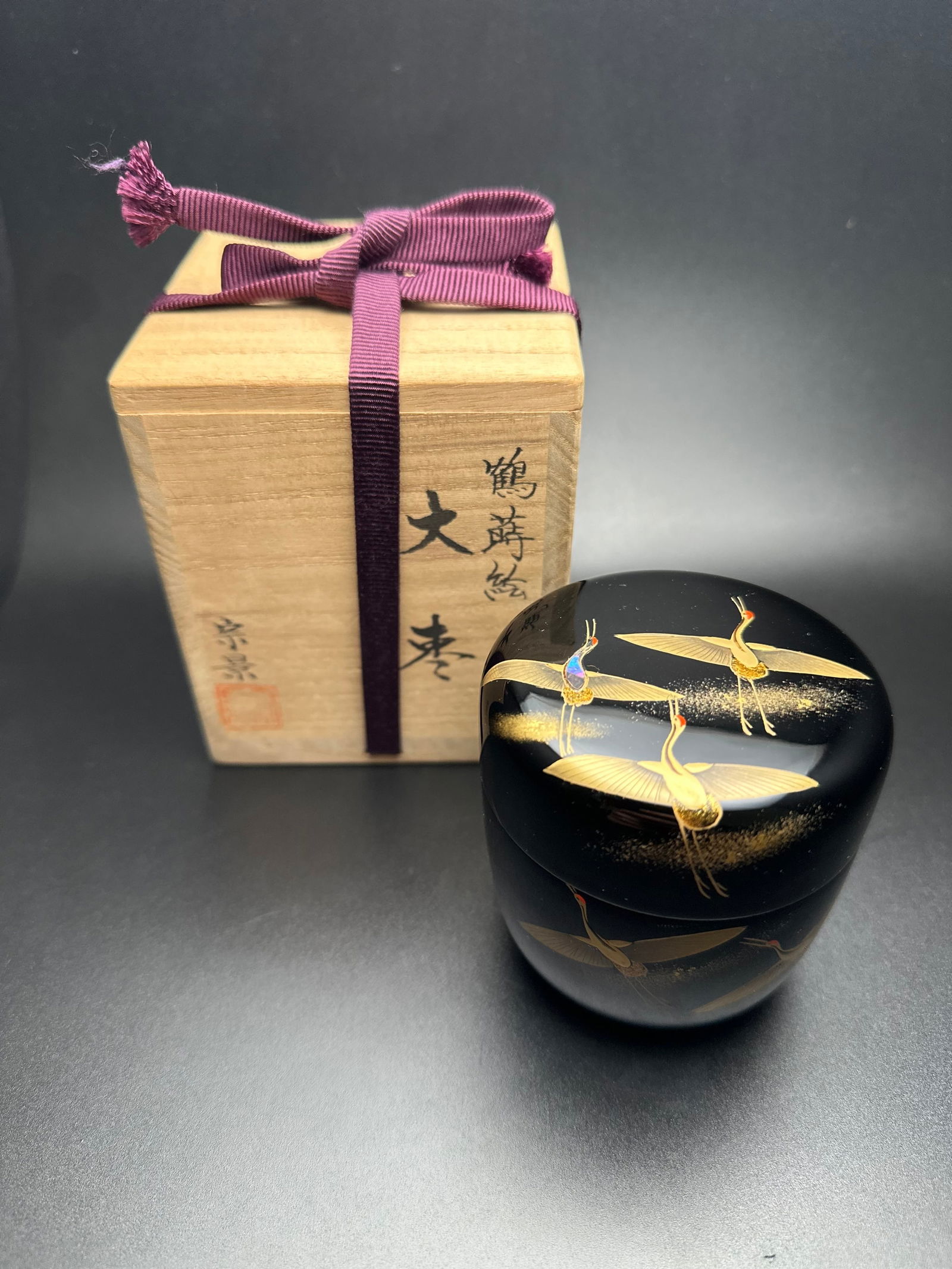 SoldJapanese Lacquer Tea Caddy with Fitted Box20th cen, japanese balck lacquer tea caddy with gold lacquer décor, fish net motif, measures 3.3"dia; Provenace: Collection of an East Coast LadySee Sold Price