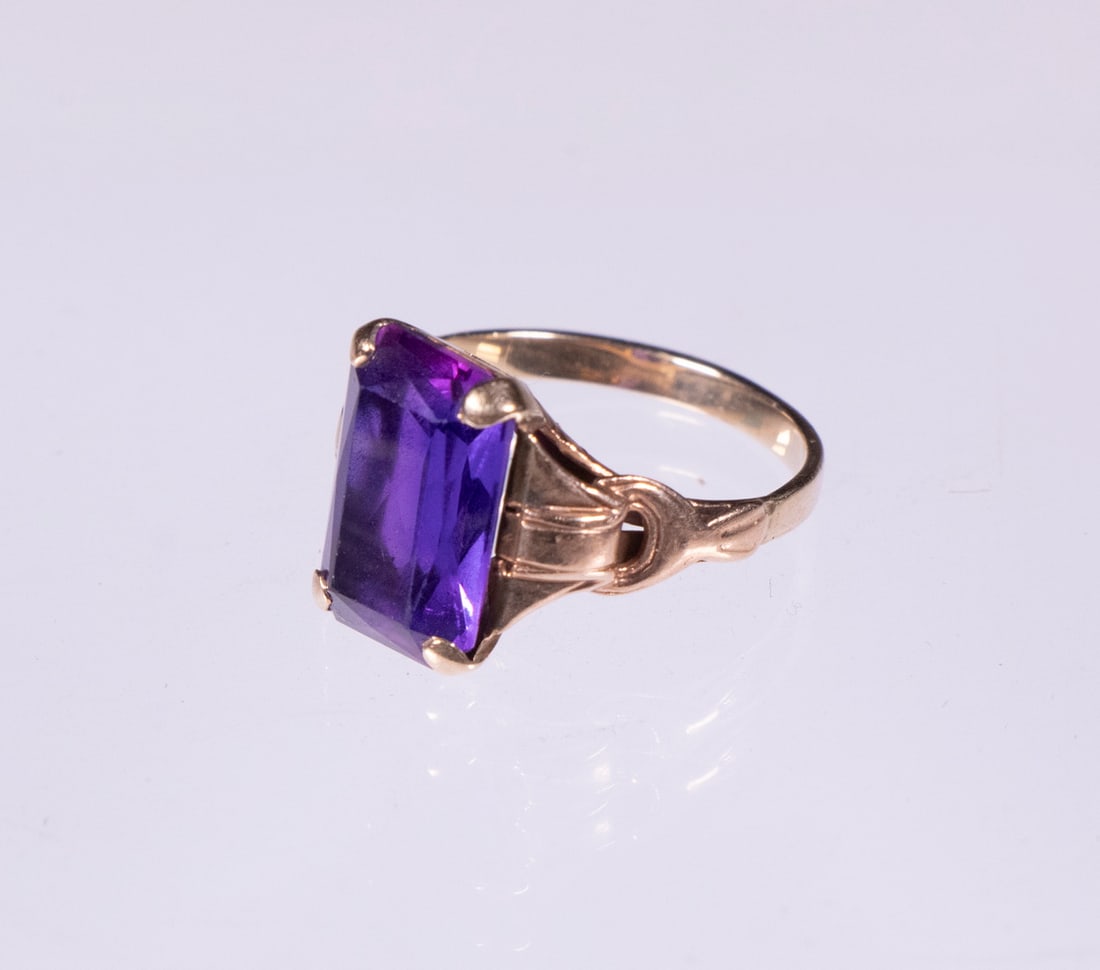 SoldAntique Ladies 14K Amethyst RingLarge Emerald-Cut Natural Amethyst measuring 18mm x 12mm. Set in a fancy Yellow gold Estate Setting. Size 7, total weight: 5.5 dwt / 8.6 grams. excellent condition.See Sold Price