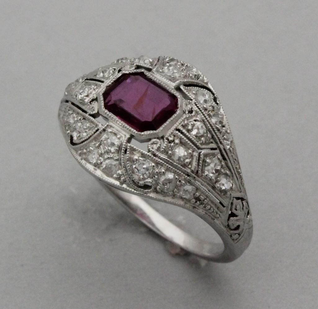 SoldCa 1915 Amethyst, diamond, ruby, platinum ladies ringBeautiful ca 1915 amethyst, diamond, ruby, and platinum ladies ring. Center set with a round cut deep red amethyst measuring 7 mm x 4.5 mm. Setting with 14 .01 to .02 ct round cut diamonds. Also havinSee Sold Price