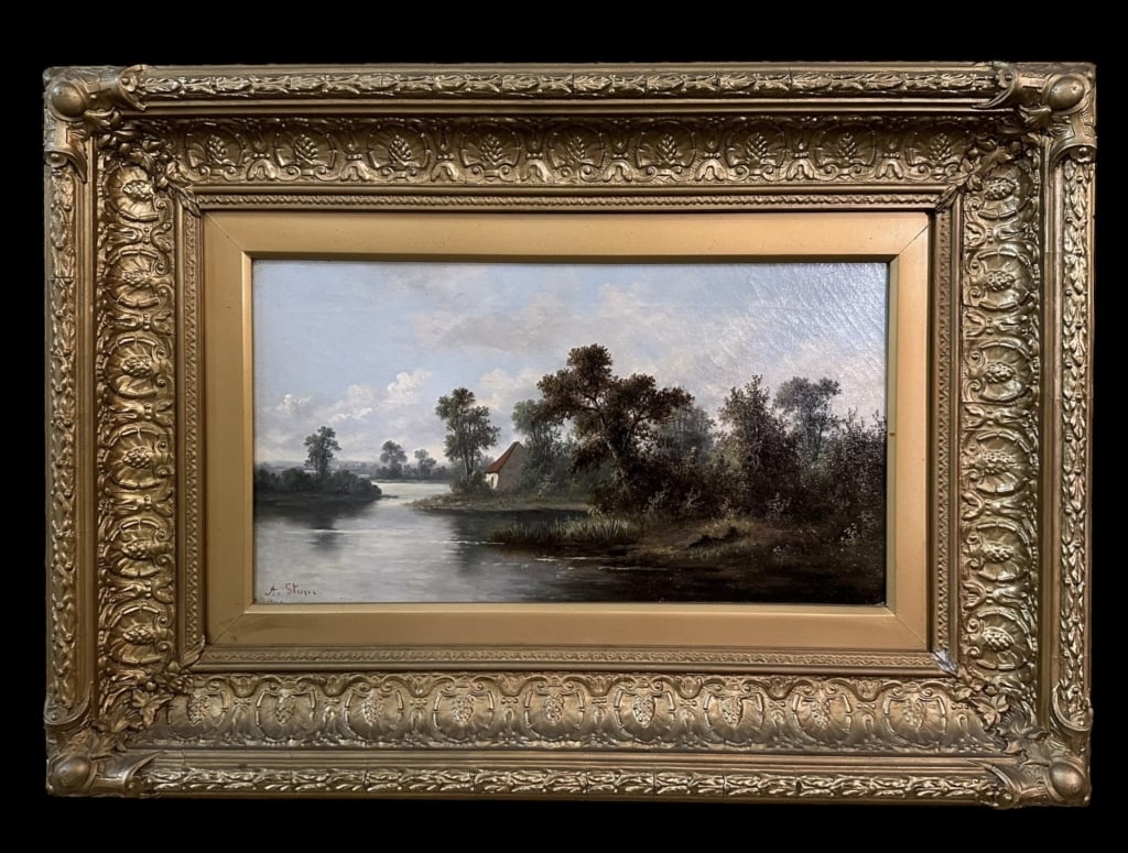 SoldLandscape with Cottage on RiverLate 19th century, oil on canvas, signed A. Stum(?) lower left, sight 9.5 x 17.5 in., gilt gesso frame..surface dust, craquelure, stretcher marks, rubbing to canvas at frame corners, not examined outSee Sold Price