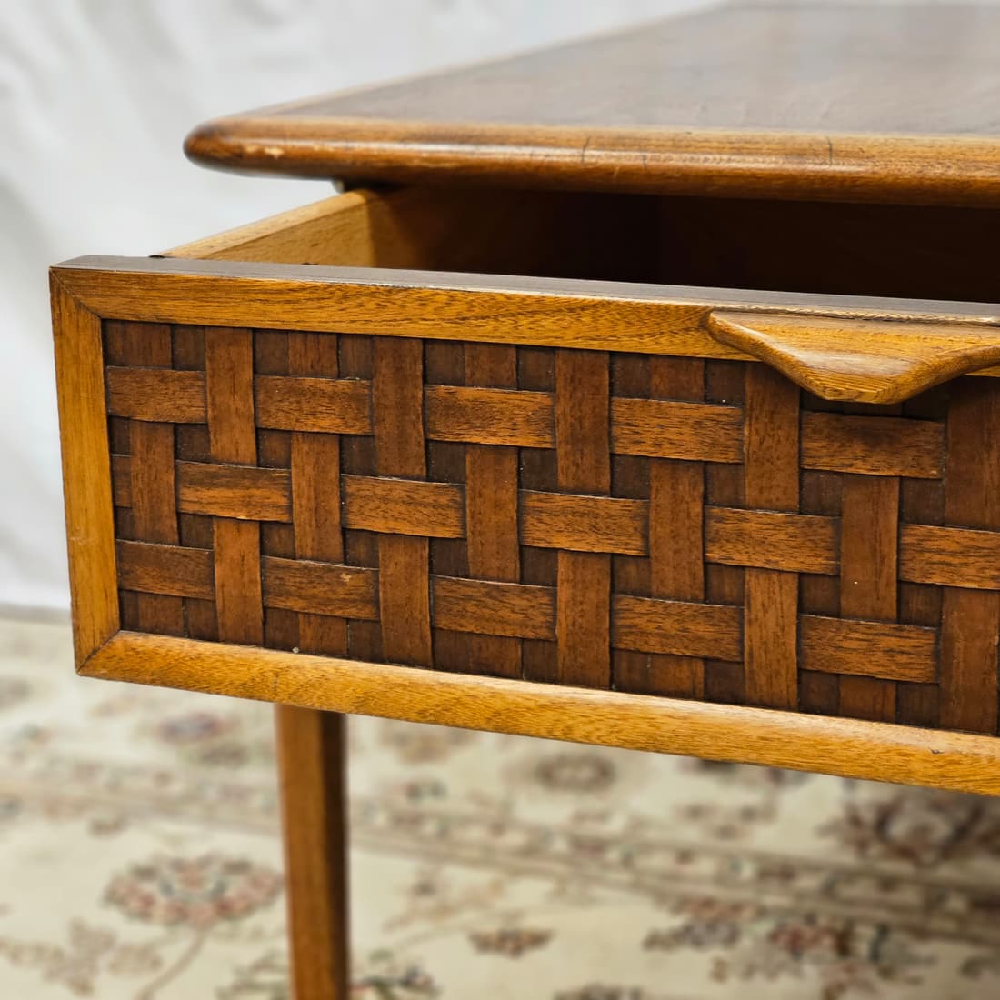 3pc LANE American Modern Walnut Tables. 1) Banded Coffee Table. 1). Step End Table. 1). Side End Tab3pc LANE American Modern Walnut Tables. 1) Banded Coffee Table. 1). Step End Table. 1). Side End Table. Each has single drawer with "woven" lattice details. Marked. Dimensions: Height: 20.5 inches, Wi