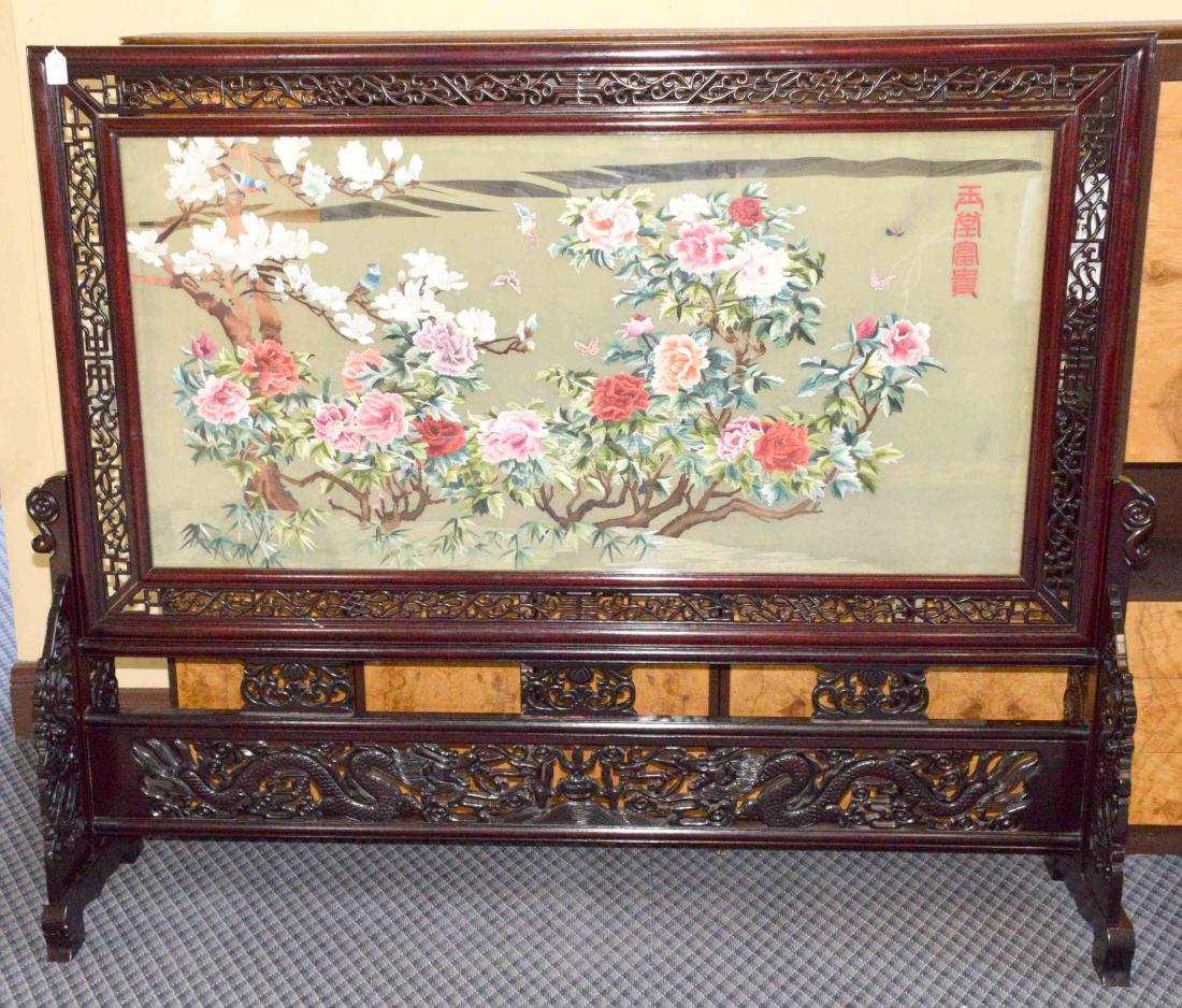 LARGE ASIAN SILK SCREEN W/STAND, intricately