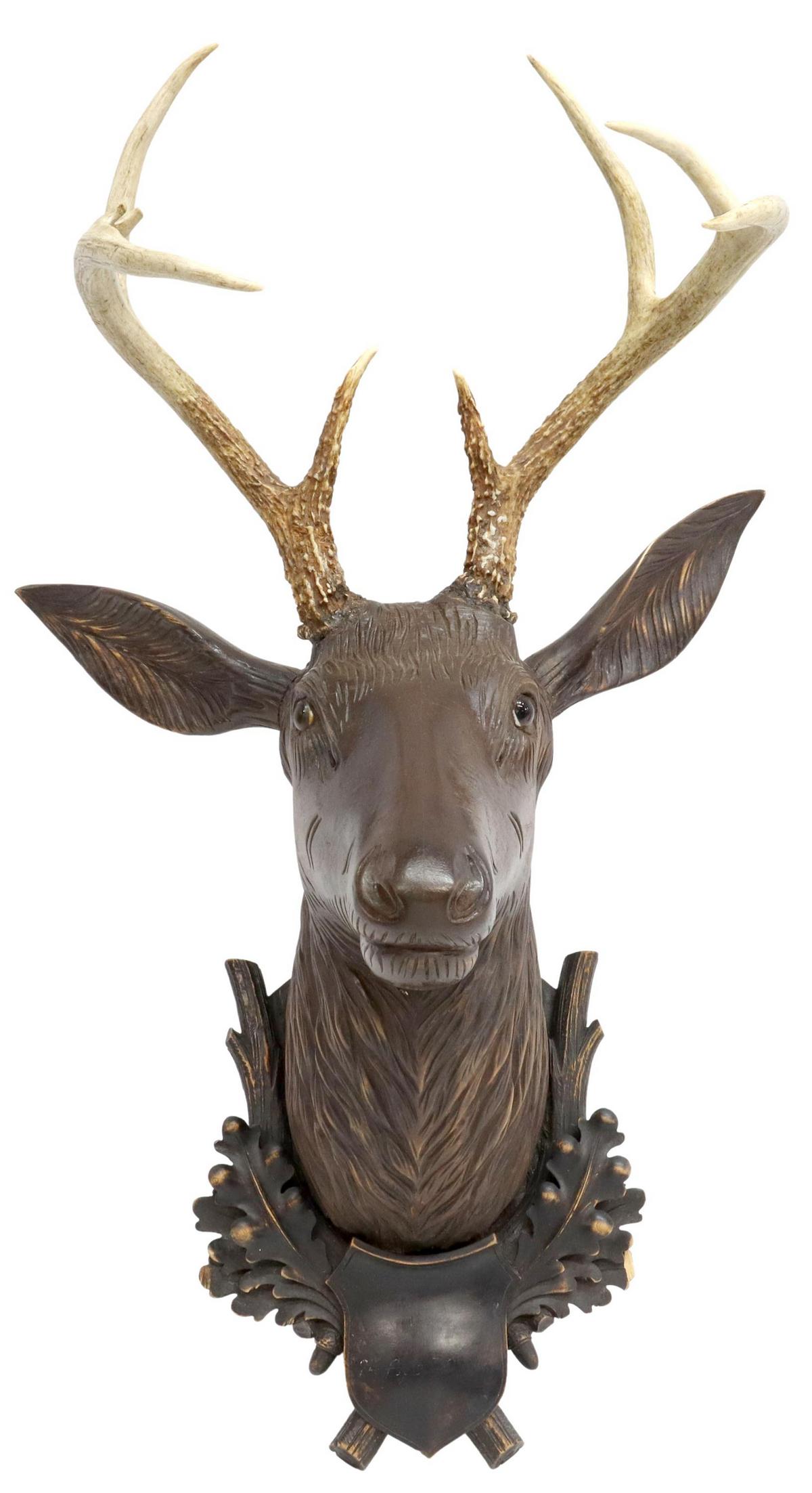 SoldCarved Black Forest Deer Head Trophy MountA well carved Black Forest mounted deer head. The trophy has glass eyes, actual antlers and is roughly 18" high (bottom of neck to top of antlers) and 10" across the ears. The mounting plaquSee Sold Price