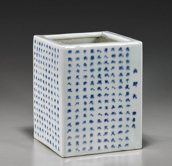 SoldA LARGE CHINESE BLUE AND WHITE PORCELAIN BRUSH POT, the exterior with rows of characters, the baseA LARGE CHINESE BLUE AND WHITE PORCELAIN BRUSH POT, the exterior with rows of characters, the base with six-character mark. 15cm highSee Sold Price
