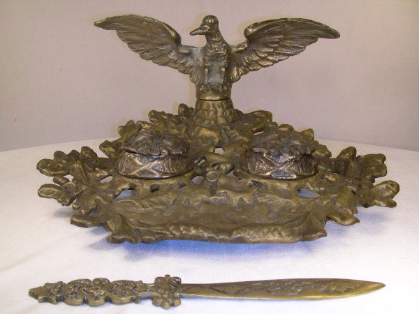 LARGE BRASS EAGLE DOUBLE INKWELL & BRASS OPENER