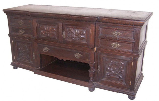 French Provincial Louis XV Style Carved Oak Buffet a Deux Corps, 19th c., the stepped rounded cornerFrench Provincial Louis XV Style Carved Oak Buffet a Deux Corps, 19th c., the stepped rounded corner crown over two large double fielded panel cupboard doors with long iron fiche hinges and escutcheon