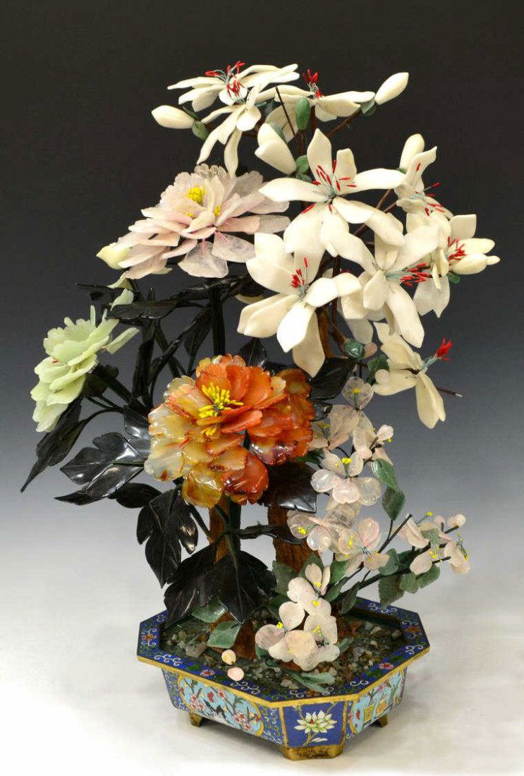 LARGE CHINESE FLOWERING HARDSTONE TREE CLOISONNE