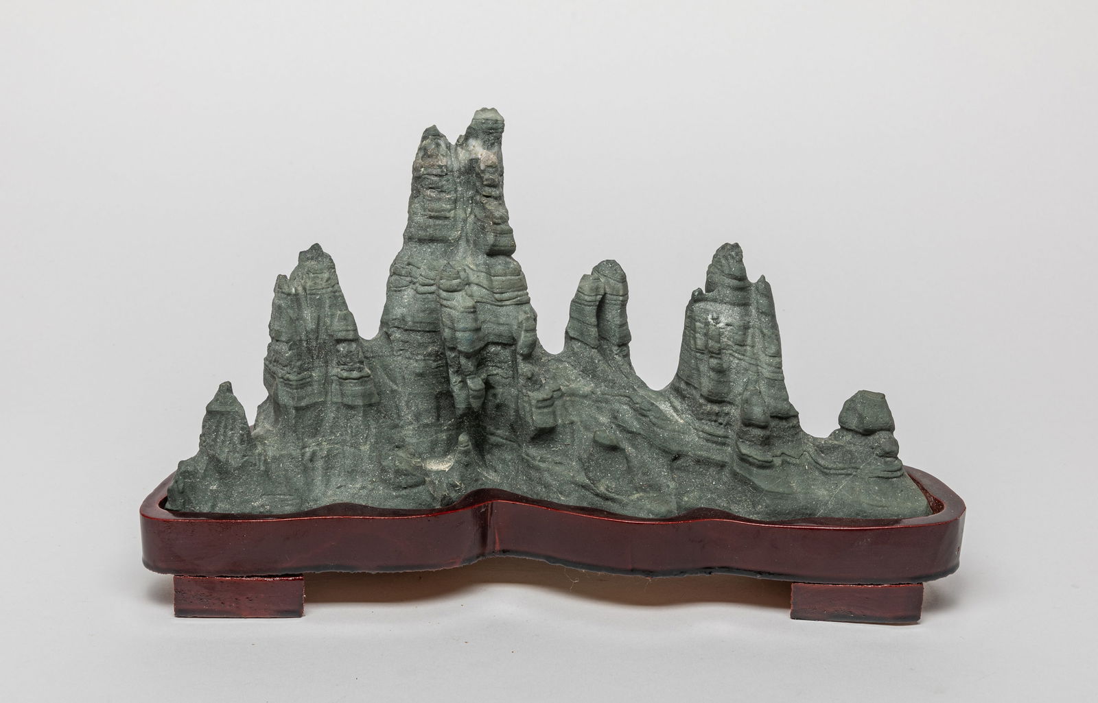 SoldLarge Chinese Export Scholar StoneOf horizontal orientation, the rock formation in the shape of a mountain range, with stand. Approx. 17*7.6*5.8 inch (w/o stand).See Sold Price