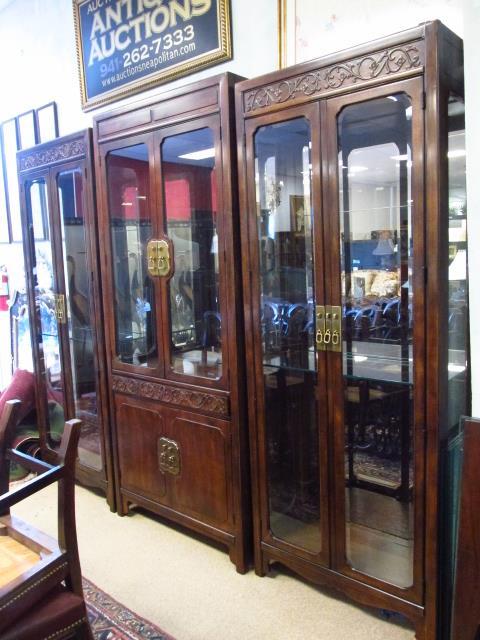 SoldHenredon Campaign Style Wall Unit.This burled wood unit comes in three cabinets, which could be separated and used as three individual pieces. Each cabinet has bevelled glass doors, glass shelves, a storage area, and 3 lower drawers.See Sold Price