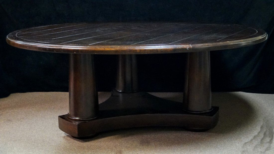 SoldContemporary Circular Game or Conference TableLarge Contemporary Circular Game or Conference Table, with an inset tooled leather top on a laminated columnar pedestal with a brass ring foot, h. 28-1/2", dia. 63".See Sold Price