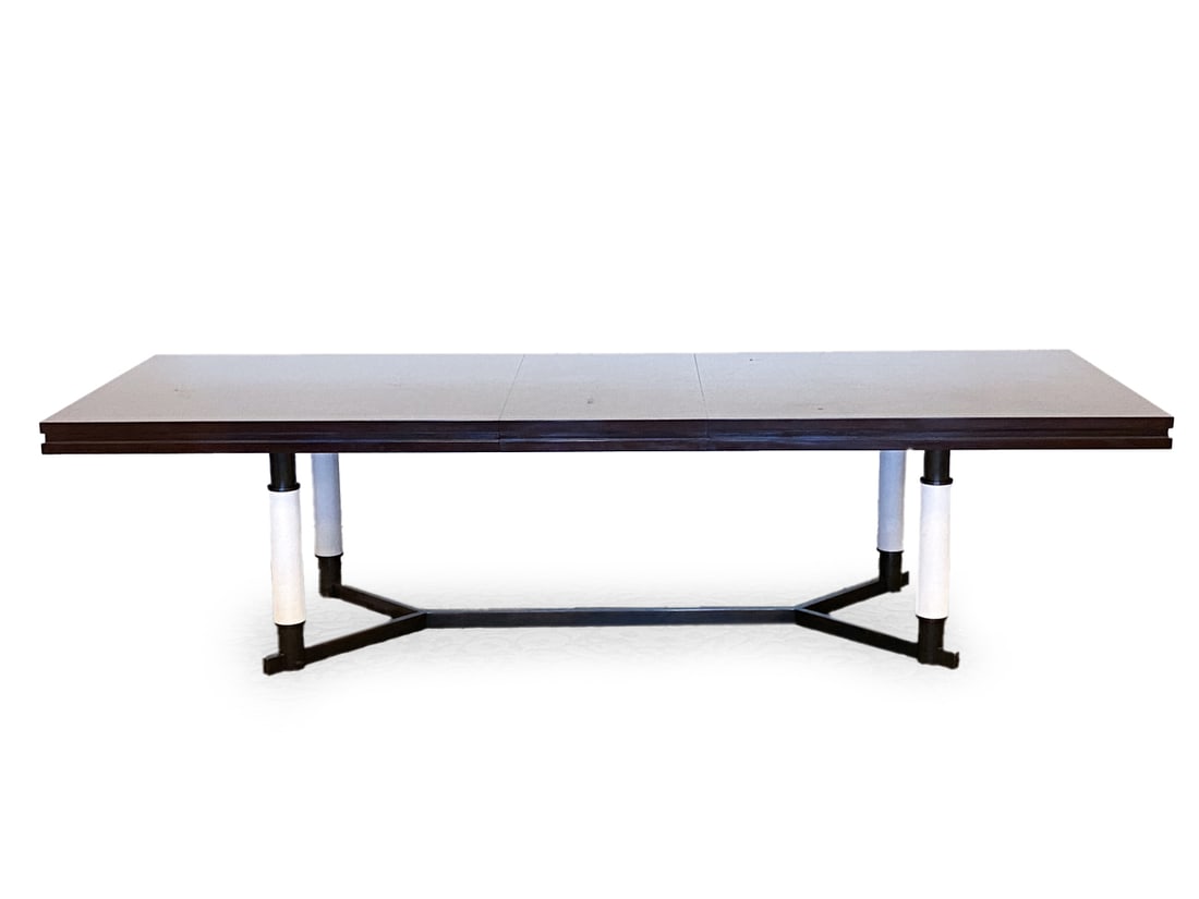 SoldLARGE CUSTOM MAHOGANY & BRONZED DINING TABLEThis table features a polished mahogany top with a patinated bronzed steel stretcher, each leg has a parchment covered shaft. Includes one leaf, screws, and original invoice. Provenance: From a Park ASee Sold Price
