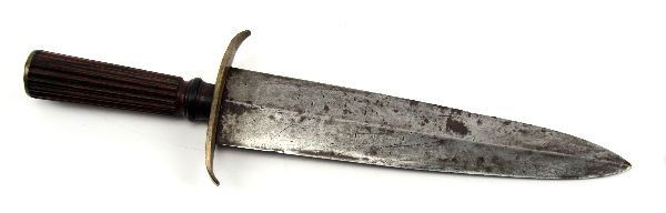 SoldMediterranean Dagger KnifeA fixed blade knife with ornate reticulated ricasso and molded knot. The blade features a broad, shallow central fuller and double edge. Dark, natural handle butts up against a nickel silver ferrule aSee Sold Price
