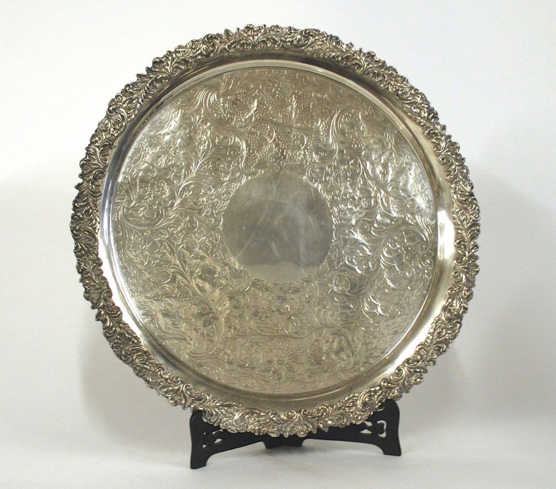 SoldLARGE BIRMINGHAM SILVERPLATE TRAYA good quality Vintage Birmingham Silver Company footed silver plate tray. Scrolling Foliage Plume with no monograms. In excellent condition. Measures 29"x18"x1 1/2". Weight 12 pds. PROVENANCE: A PrivSee Sold Price