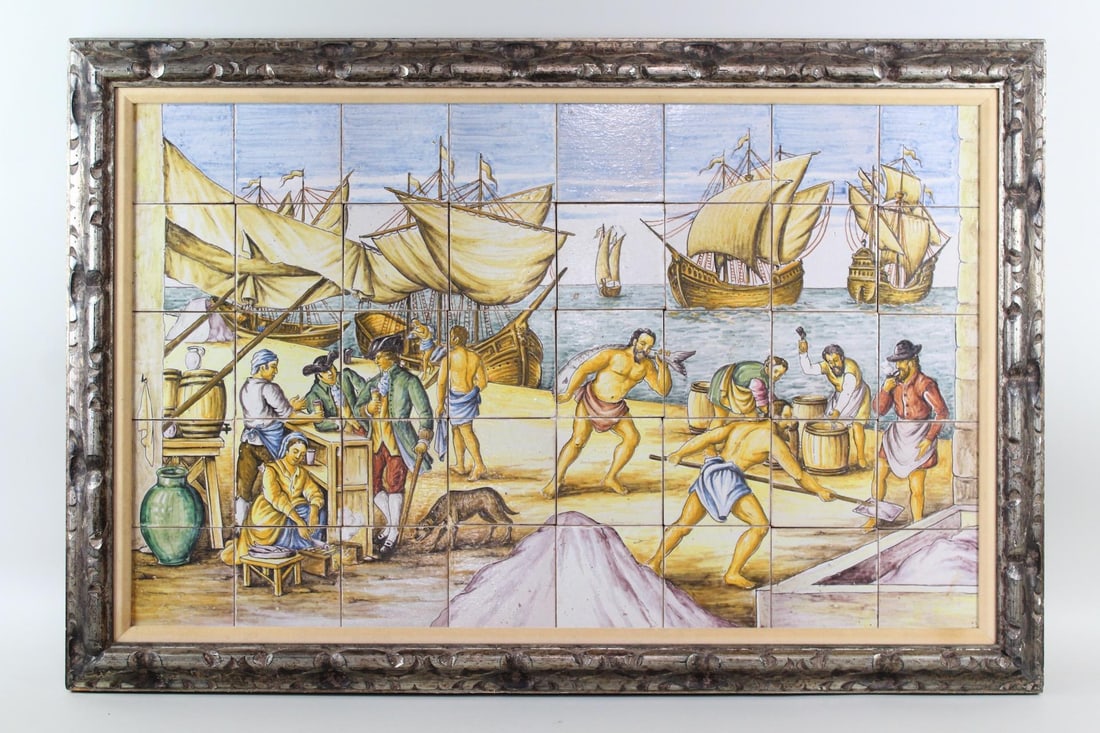 Large Framed Tile Picture with Harbor Scene