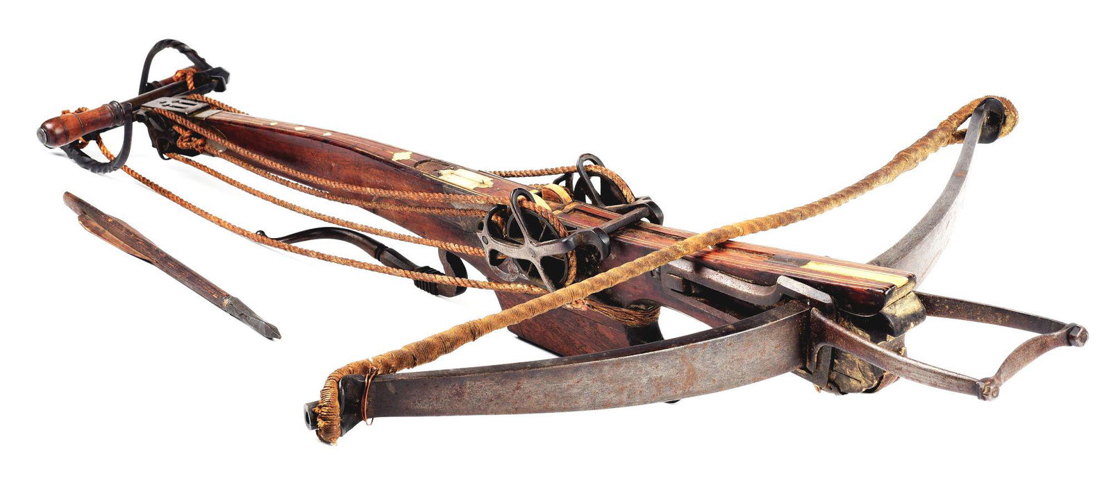 LARGE GERMAN SIEGE CROSSBOW WITH WINDLASS AND QUARREL.