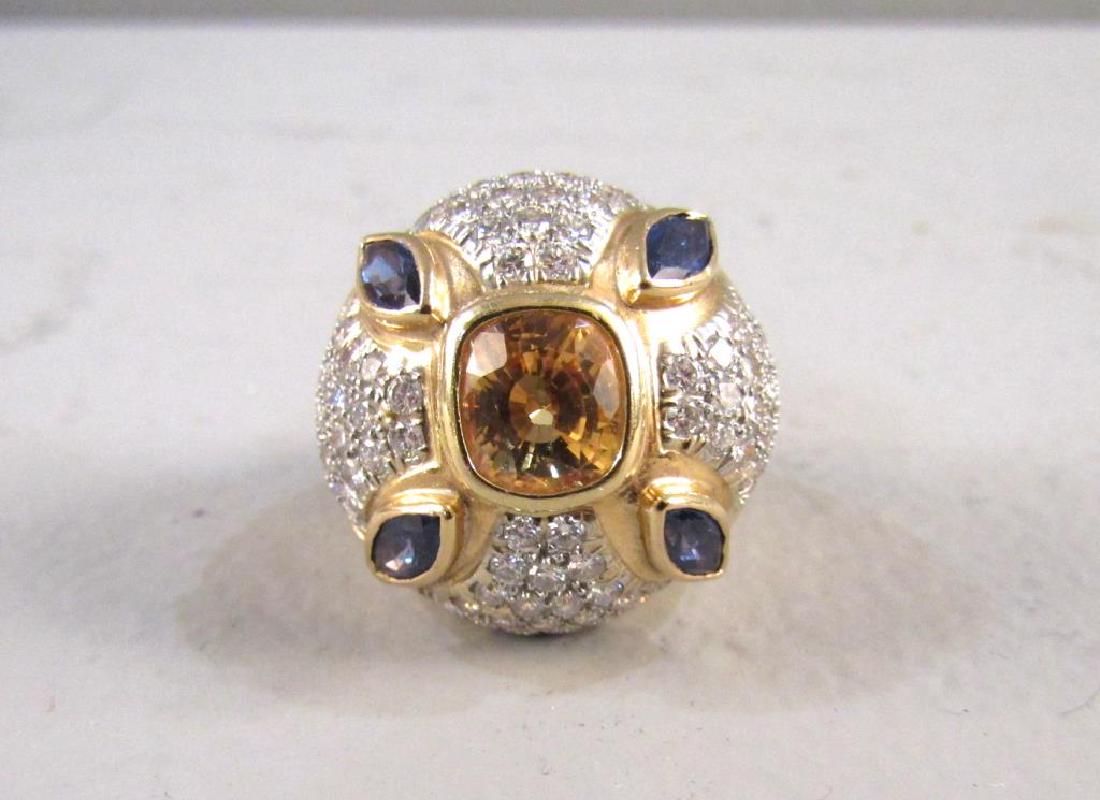 Sold14K Gold, Diamonds, Sapphires & Crystal Cocktail Ring14K Yellow Gold, Diamonds, Sapphires & Large Cut Crystal Cocktail Ring Weight 7.4g, Size O 1/2, 7 1/4 International Ring Size Conversion Chart - http://www.ringsizes.co/ Quantity: 1 Condition: GoodWeiSee Sold Price