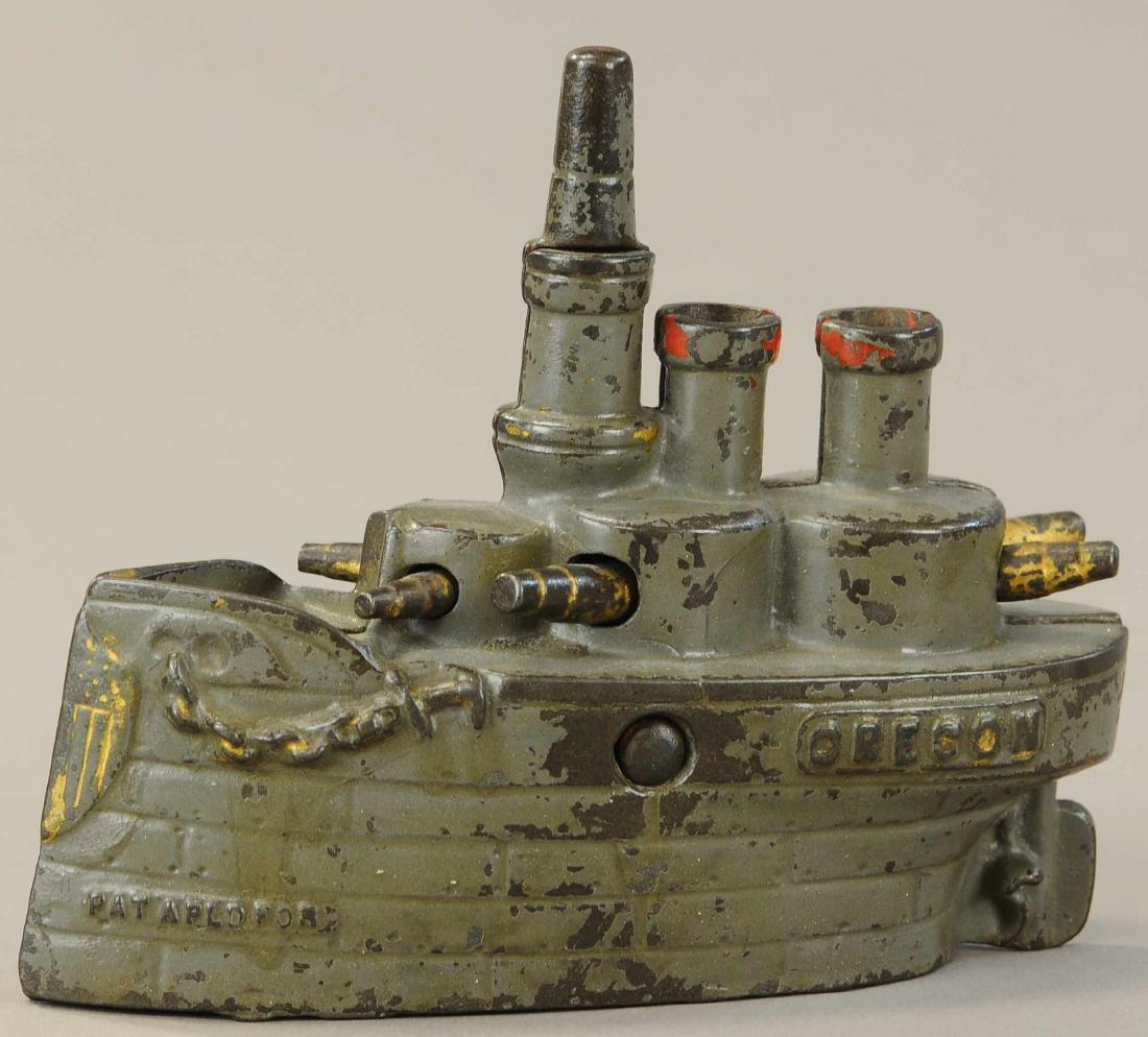 SoldBATTLESHIP OREGON STILL BANKc. 1891, J. & E. Stevens Co., cast iron, japanned and gold highlights, embossed "Oregon" on side, small version. 5" l.See Sold Price