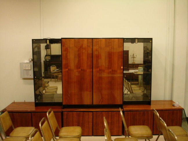 Extra Large Mid Century Modern Teak Three Tier Wall Unit Bookcase Display Case With Lights InstalledExtra Large Mid Century Modern Teak Three Tier Wall Unit Bookcase Display Case With Lights Installed Under Each Shelf 79.5"H X 135"W X 18"D This Item is One Whole PieceBY BIDDING ON ANY ITEM, ALL BIDD