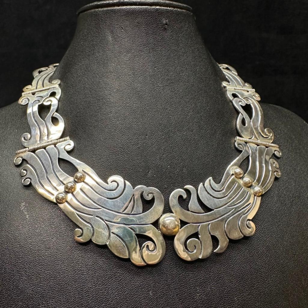 SoldLarge Hinged Sterling Necklace Melasio RodriguezThis piece of jewelry has been tested and researched prior to listing. Please view all our pictures they are part of our description. DETAILS: Metal - Sterling Silver Color - Silver Stones - none HalSee Sold Price