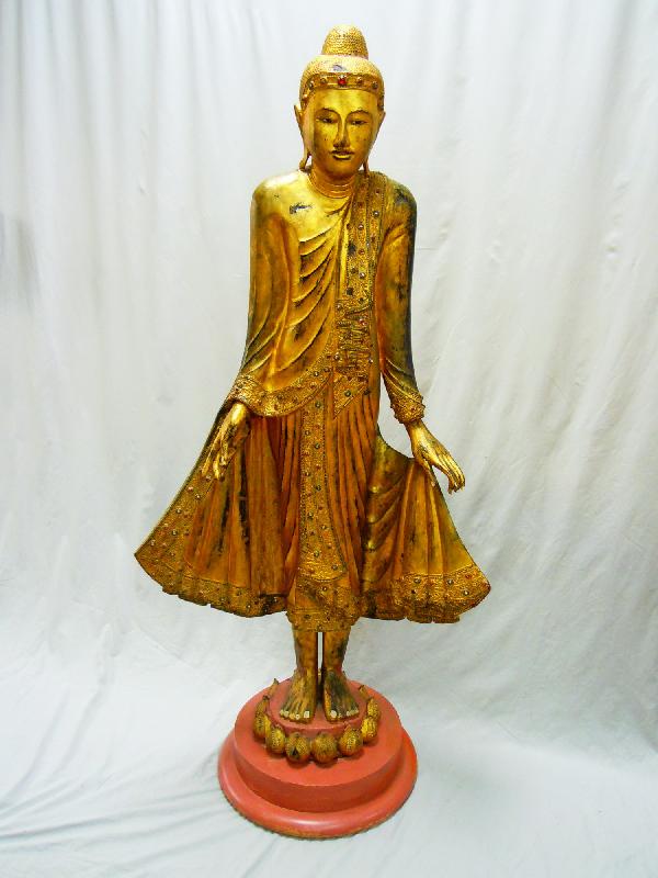 SoldLARGE THAI WOOD BUDDHABuddha with the long ears, Thai standing wood Buddha gilt paint well carved and friendly measuring 15 in W x 41 in H Shipping: Shipping costs are not included but both international and national shipSee Sold Price