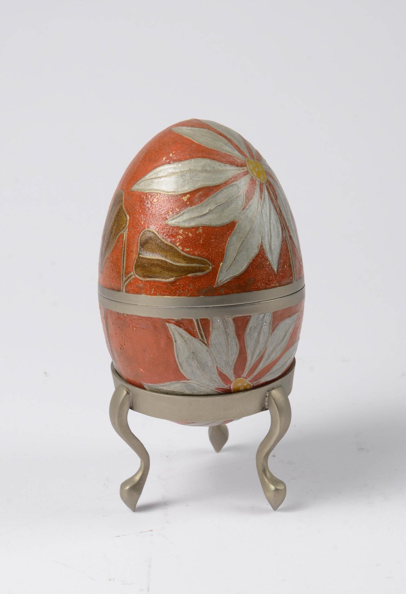 LARGE RUSSIAN SILVER ENAMEL EASTER EGG WITH A STAND