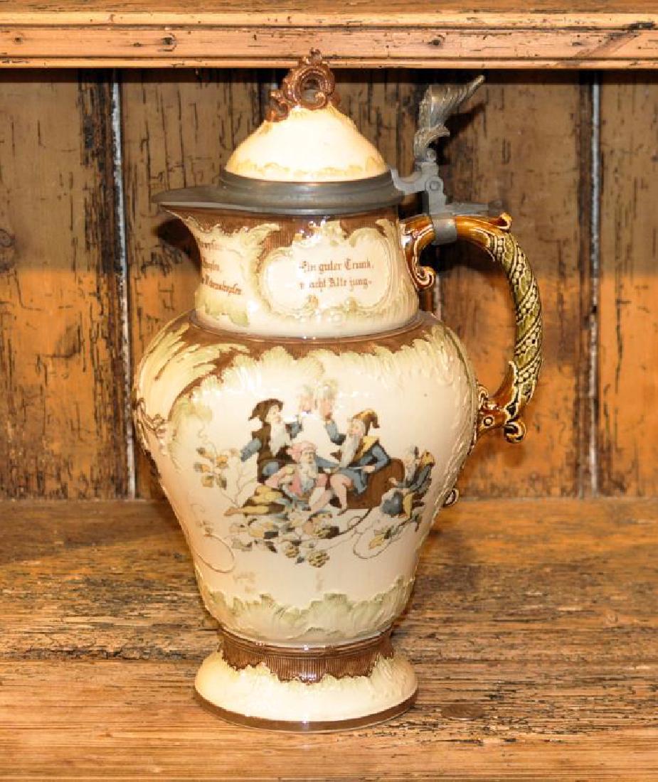 Large Mettlach Pitcher, Pewter Mounted Lid