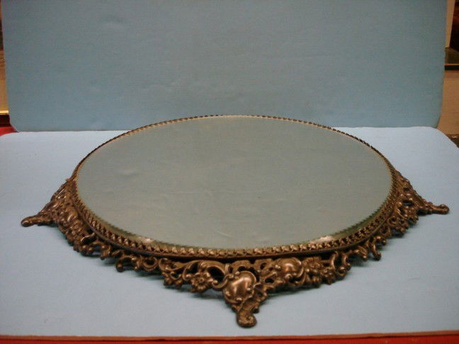 SoldMirrored Top Victorian Plateau TrayA Victorian beveled and carved braided design border round mirror tray having cast brass base with inset mirror.See Sold Price