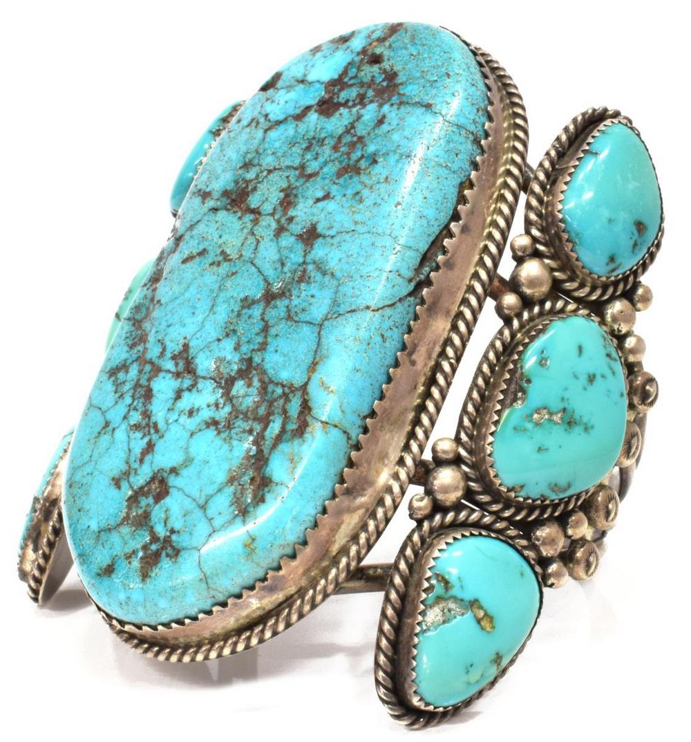 SoldLarge Navajo Silver and Turquoise Cluster Cuff BraceletLarge Navajo Silver and Turquoise Cluster Cuff Bracelet second quarter - mid 20th century set with fifteen turquoise stones; not marked cuff width 1-7/8 inches, interior circumference 5-7/8 inches + gSee Sold Price