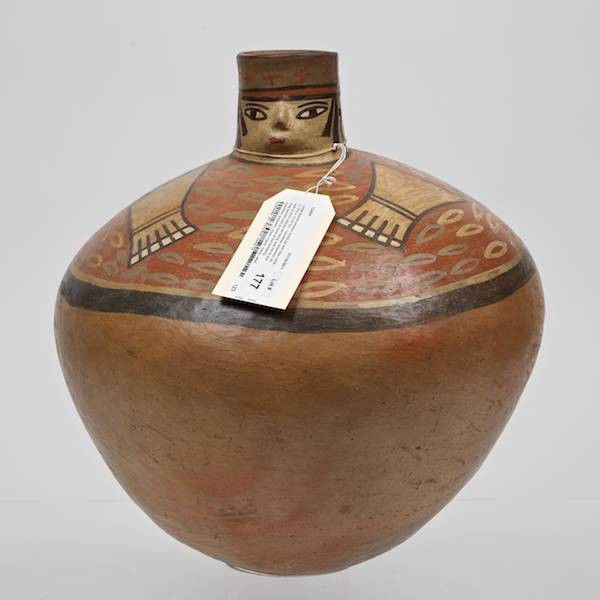 Large Nazca ceramic ovoid jar with face collar