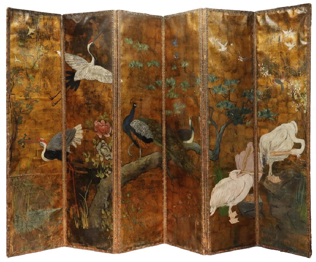LARGE PAINTED LEATHER SIX-FOLD FOLDING SCREEN