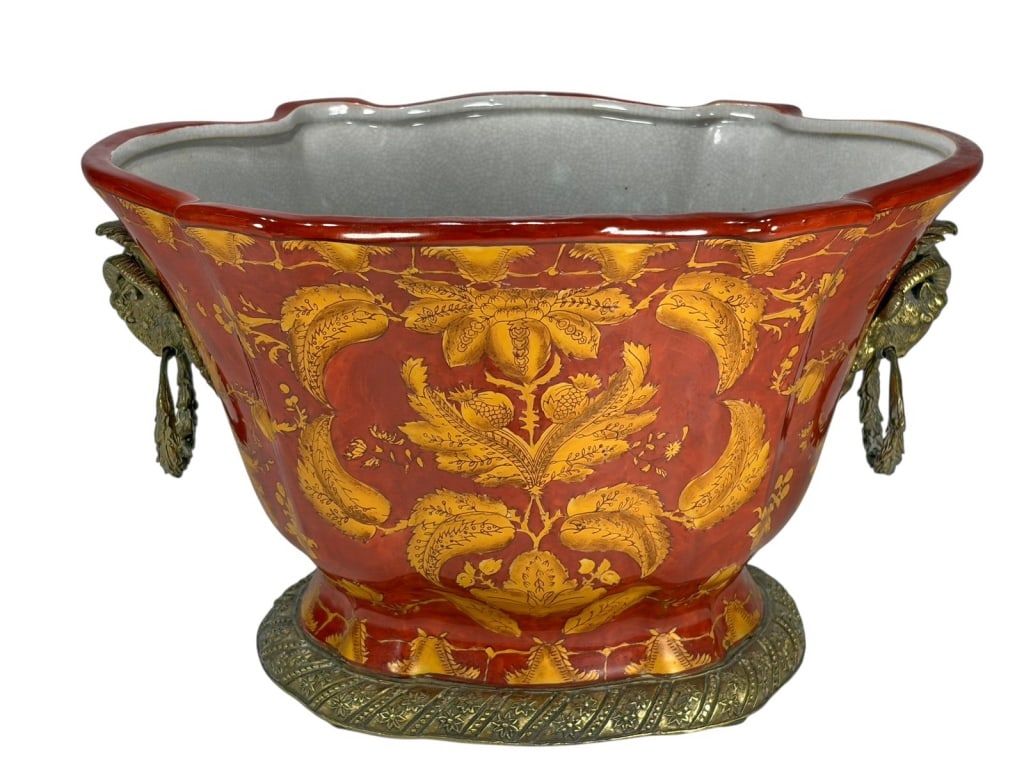 Misc. estate lot porcelains, etc. including large handles jardinaire or bowl with handles and floralMisc. estate lot porcelains, etc. including large handles jardinaire or bowl with handles and floral decorated, porcelain mantel clock, 15.5" high floral decorated vase, (2) Wedgwood vases in boxes, A