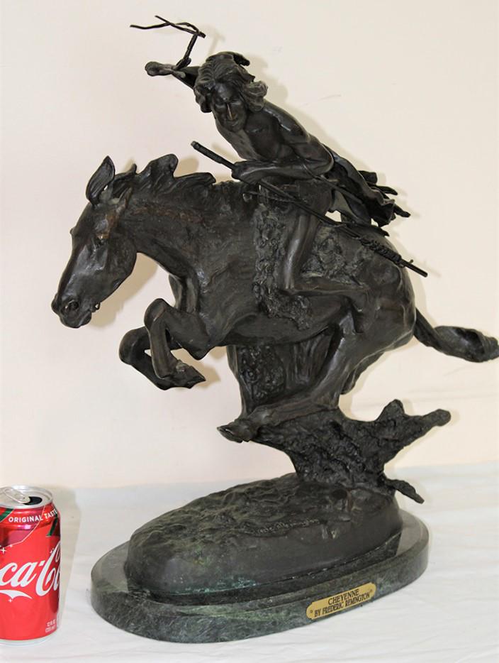 SoldLarge High Quality Remington Bronze Titled "Cheyenne"Large high quality Remington bronze titled "Cheyenne" in nice patina. Original marble base. 23" wide, 20" tall, 9" deep.See Sold Price