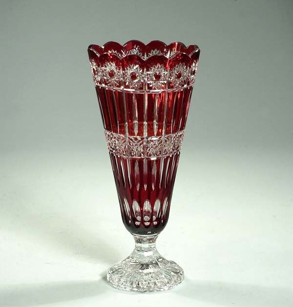 Large Ruby Overlay Cut Crystal Vase With Scalloped